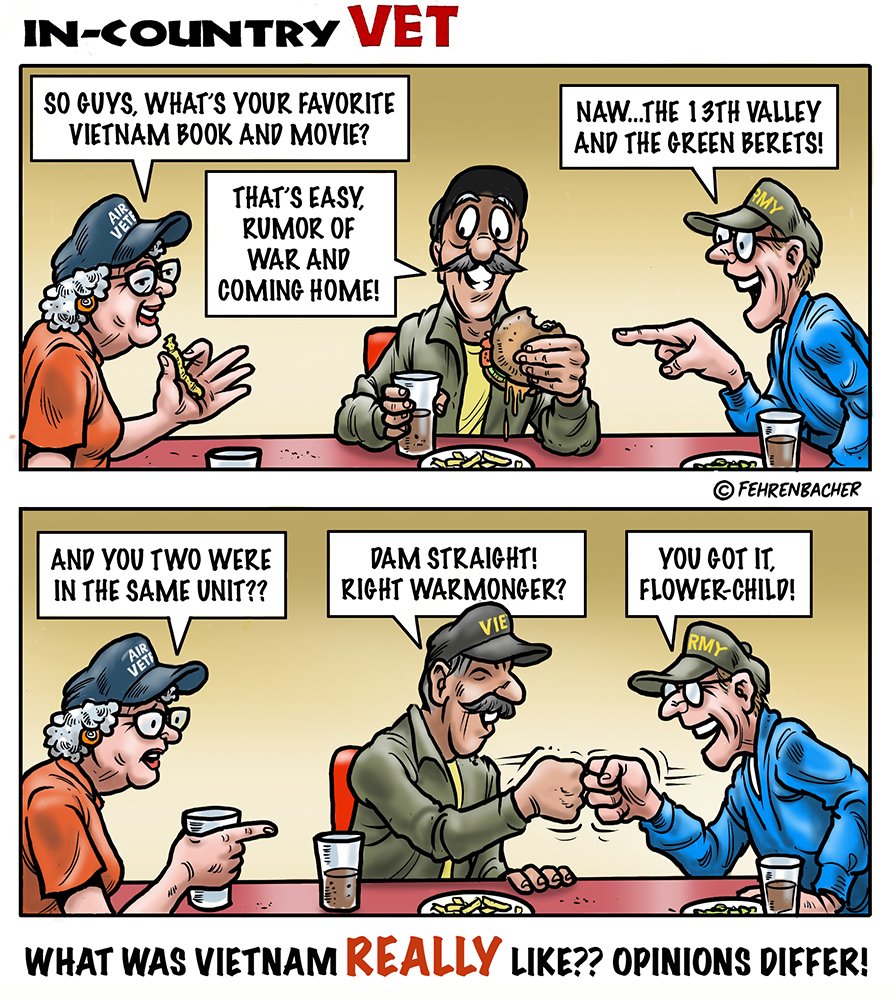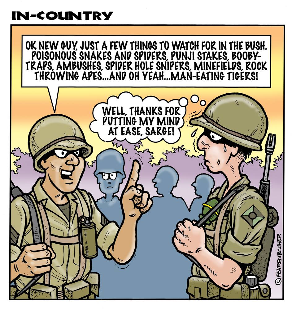 Phil enlisted in the Army in 1965 where he served for years in Vietnam.  He became a graphic designer and has worked for the state of Oregon for 26 years.  He retired in 2003 and started the Cartoon "In-Country".  The cartoons reflect his experiences during his tour of duty in South Vietnam.